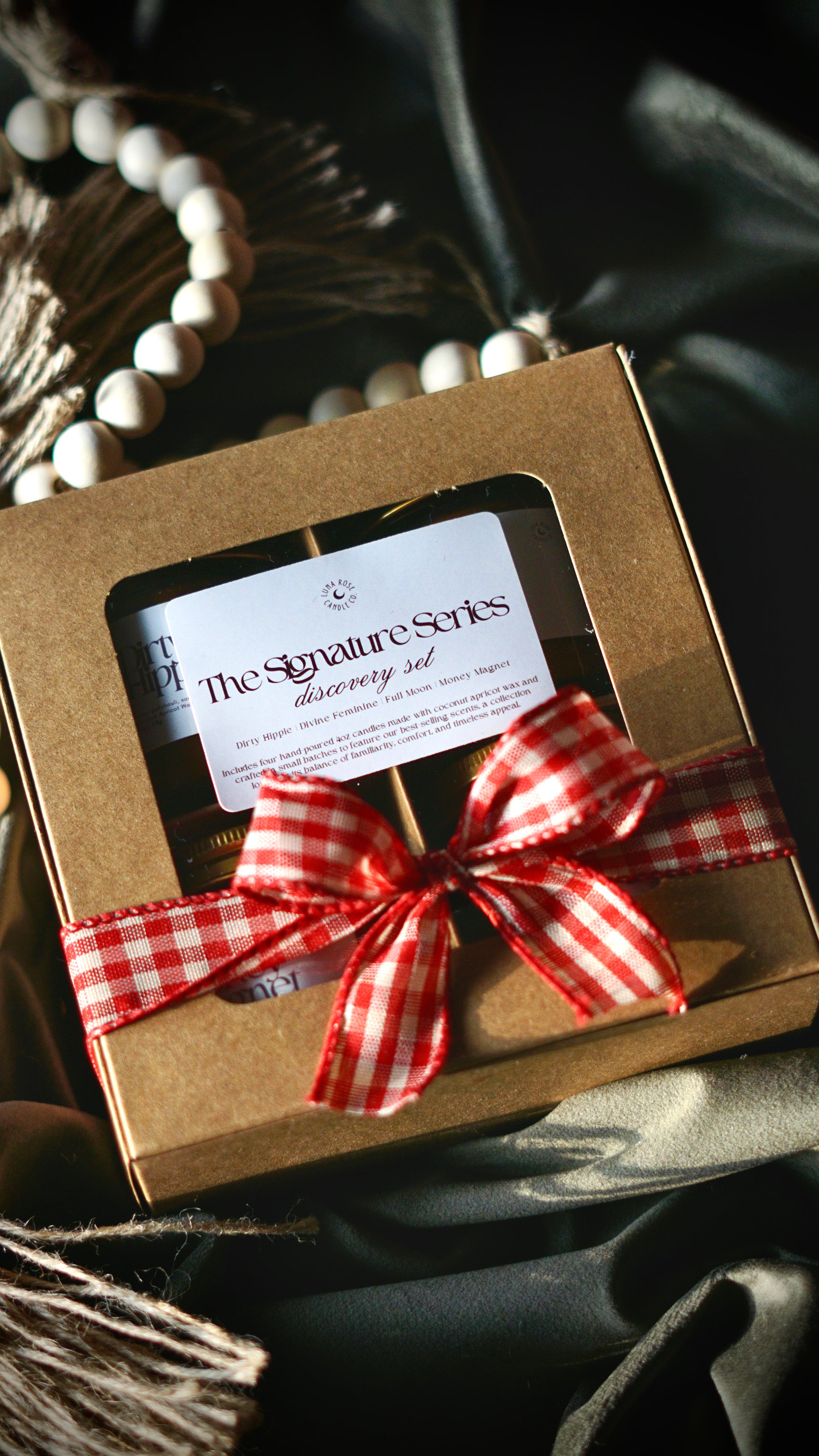 The Signature Set — Our most-loved scents, crafted to define the heart of the brand. Full Moon, Money Magnet, Divine Feminine, Dirty Hippie