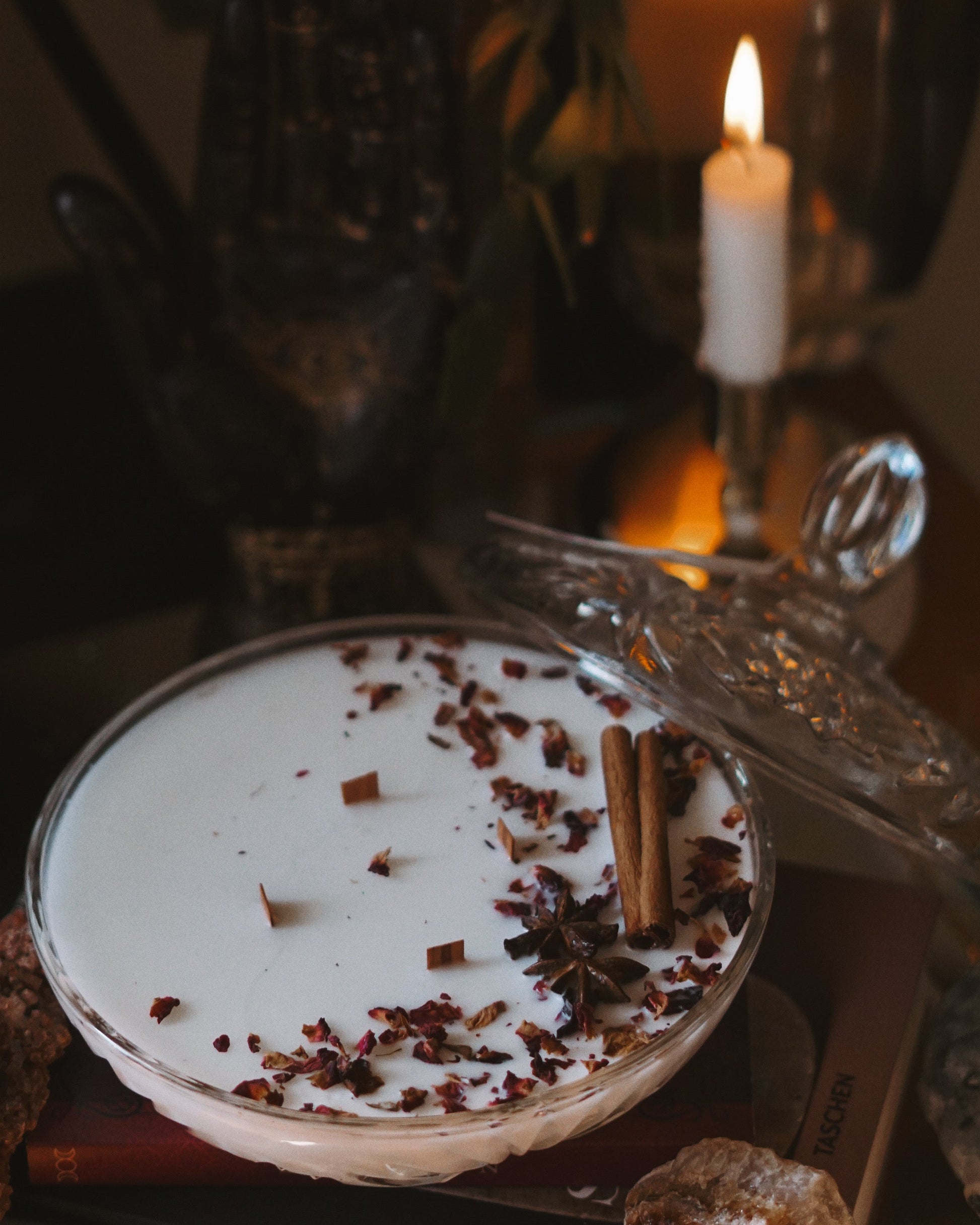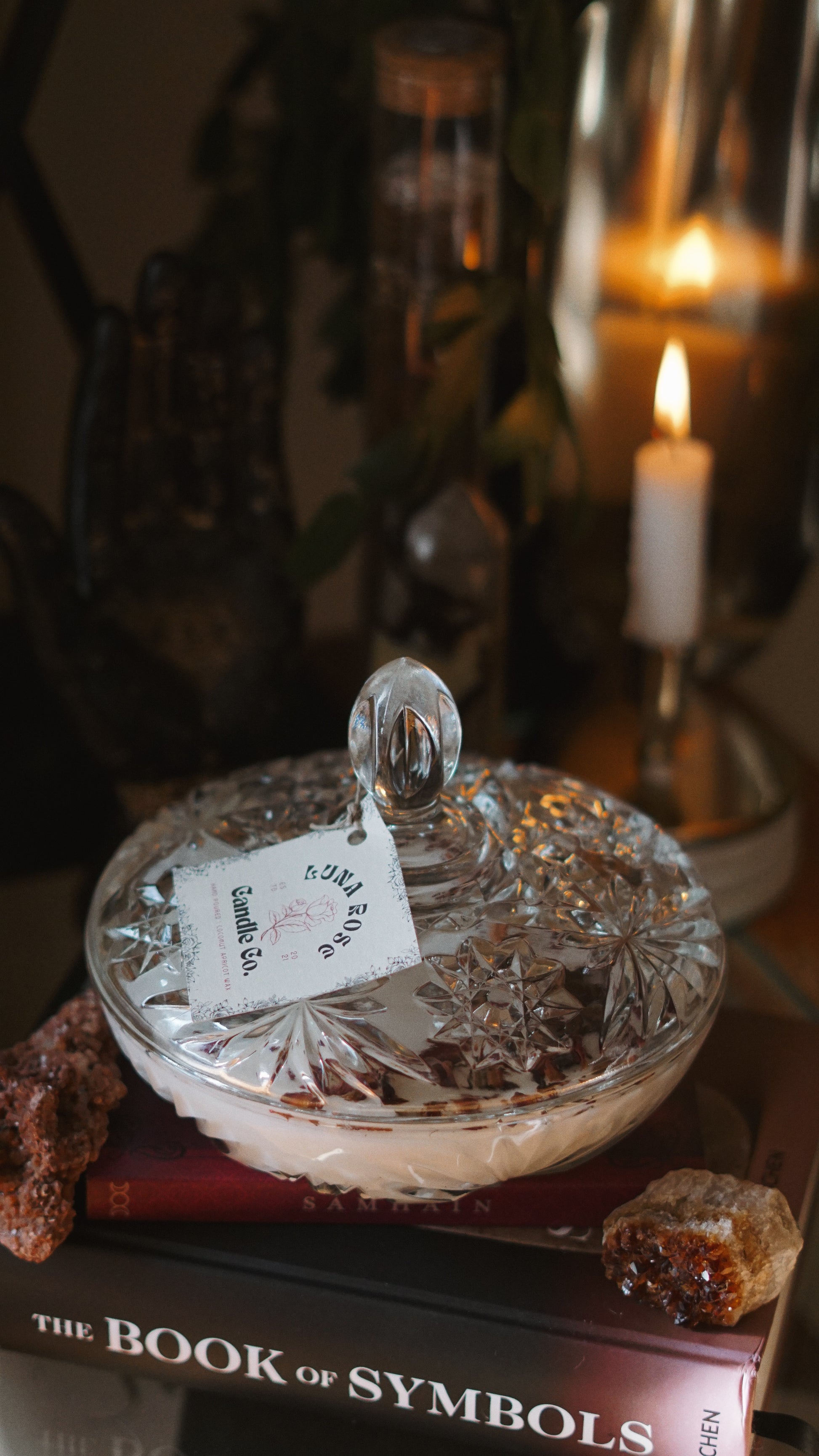 This 18oz candle is hand-poured into a genuine vintage crystal candy dish with a matching lid, transforming a timeless piece of glassware into a statement of warmth and beauty. Four wooden wicks crackle softly as they burn, casting a golden glow that dances through the cut crystal. Each jar is one-of-a-kind, a keepsake meant to be treasured long after the candle has finished. Perfect for filling your space with scent, light, and a touch of romance.