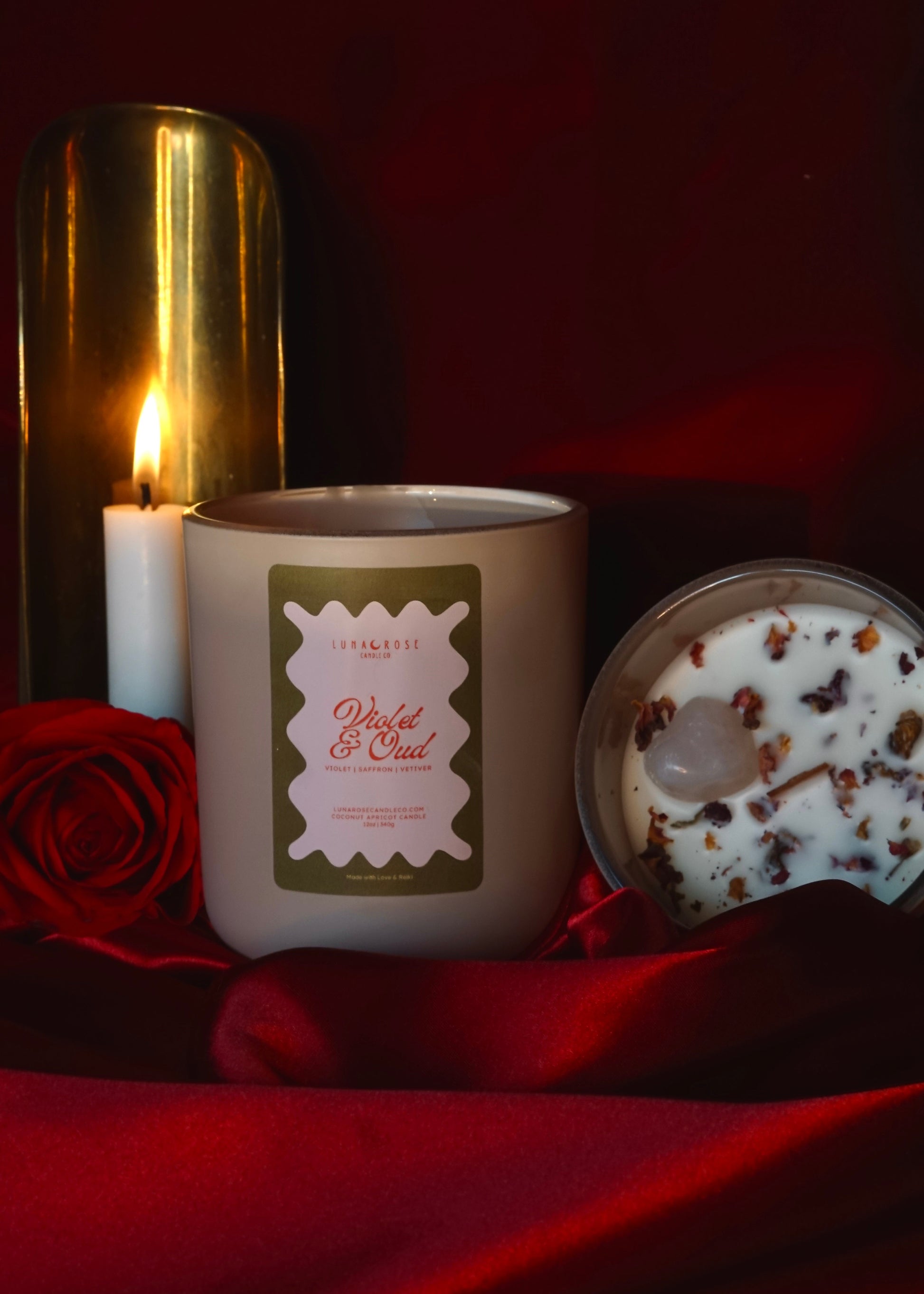 Deeply romantic with a touch of magic. Spicy cardamom and sacred palo santo set a passionate tone, while violet and saffron weave a spell of love and allure. Smoky woods, sandalwood, and amber ground the scent, creating a cozy, intimate vibe. Perfect for setting the mood and celebrating love in all its forms.
